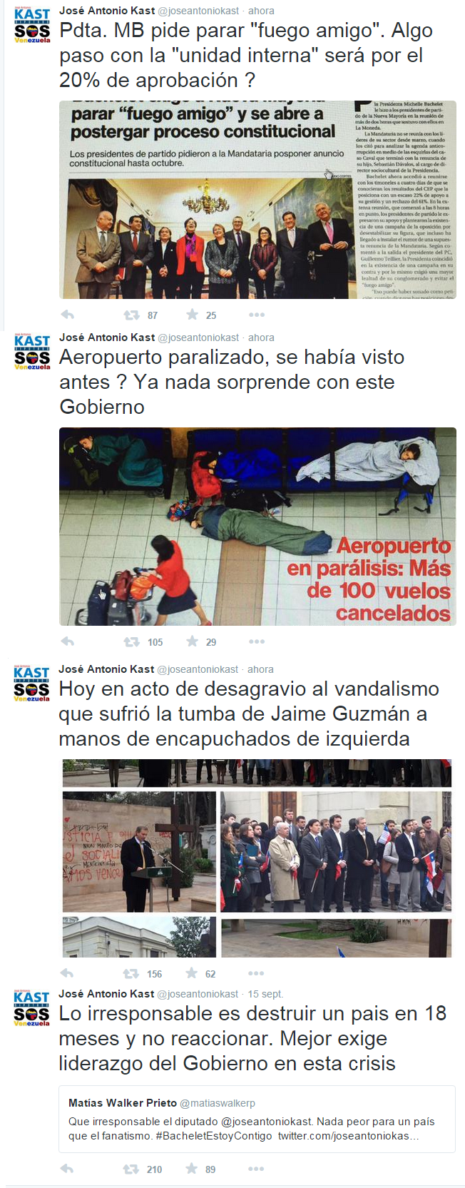 Lo que sí queda claro es que esta verdadera campaña del terror, a partir de rumores que inició de manera irresponsable Radio Bio BIo y a la que se han plegado medios como El Mostrador y los columnistas de La Tercera y El Mercurio. En nada ayudan al país y menos a generar un clima de diálogo que requiere el momento político por el que pasa el país, un clima enrarecido por los casos de corrupción y una crisis de confianza en la política en general, pero que golpea mayormente a la oposición, esa que representa el diputado Kast, porque es la Alianza la que concentra el mayor rechazo ciudadano en todas las encuestas, alcanzado el 75% de desaprobación como señaló la última Adimark.