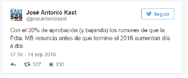 Pero Kast, además del comentario en su cuenta de Twitter, reforzó su idea señalando que: “Esa es una decisión que tiene que tomar ella, y claramente si en las encuestas ella baja del 20 por ciento -que es una mínima muy simbólica- ella tendrá que resolver qué va a hacer. Pero hoy día hay un desgobierno, hoy día no hay liderazgo, hoy día nadie conduce a este país como corresponde. Por lo tanto, es una acción que ella tiene que adoptar en algún momento”.