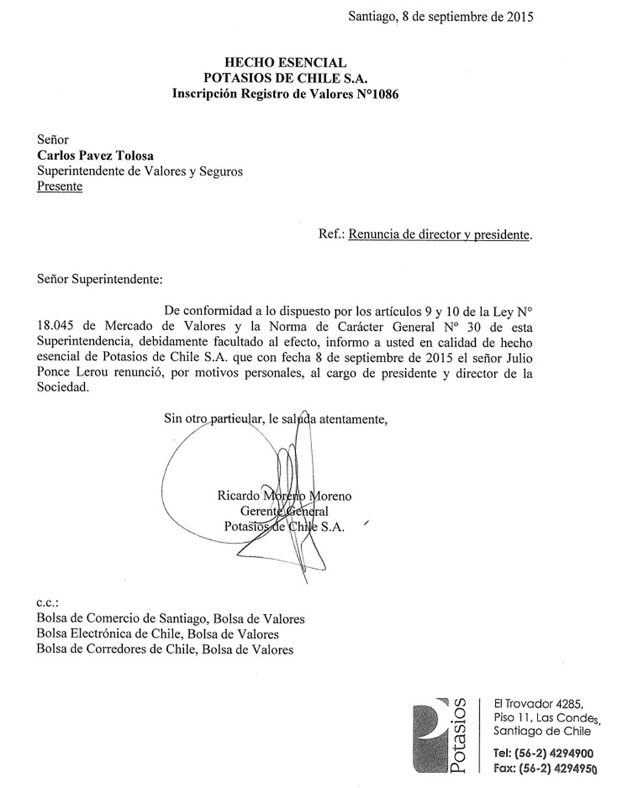 Un escueta nota, enviada a la SVS, da cuenta de la renuncia de Ponce Lerou.