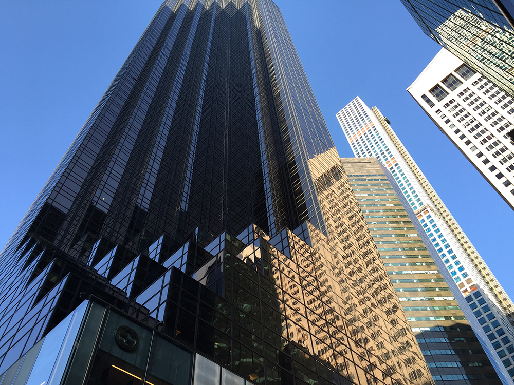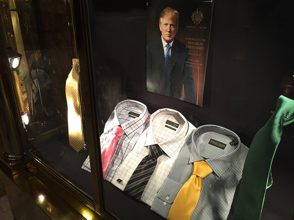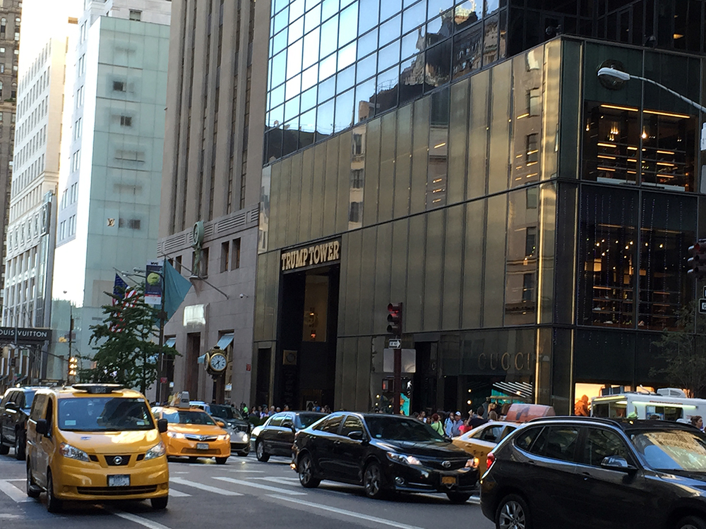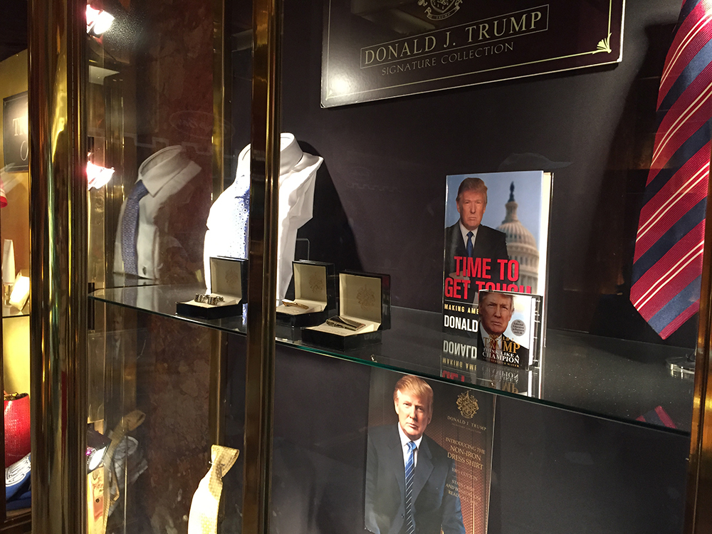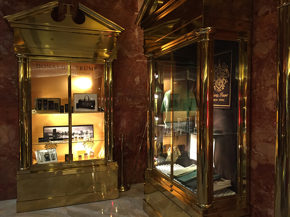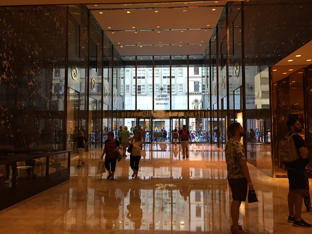 En el Trump Tower todo brilla partiendo por el reloj que adorna la vereda, la fachada y el interior del lobby. En el diseño interior del edificio proliferan una gama de colores cafe y negro marmoleados y principalmente de dorados, desde el piso hasta el techo. En el recibidor se puede leer por todas partes la palabra «Trump» ( como un recordatorio para no olvidar donde se está). En dos amplios mesones de madera color chocolate se pueden adquirir souvenirs como: osos de peluches, poleras cuello polo, libros y otros regalos elegantes.En otros dos aparadores de bronce brillante, hay camisas y otros artículos de la línea que representan al famoso magnate y candidato a la presidencia de Estados Unidos.