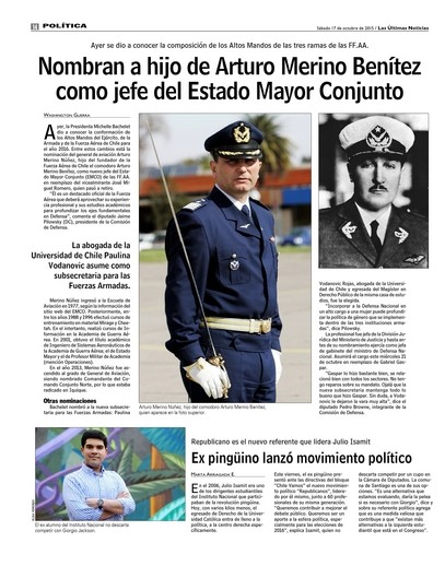 LUN corrigió la crónica a eso de la 1 de la madrugada de este sábado y cambió totalmente la crónica titulando: “Ayer se dio a conocer la composición de los Altos Mandos de las tres ramas de las FF.AA. Nombran a hijo de Arturo Merino como jefe del Estado Mayor Conjunto”.