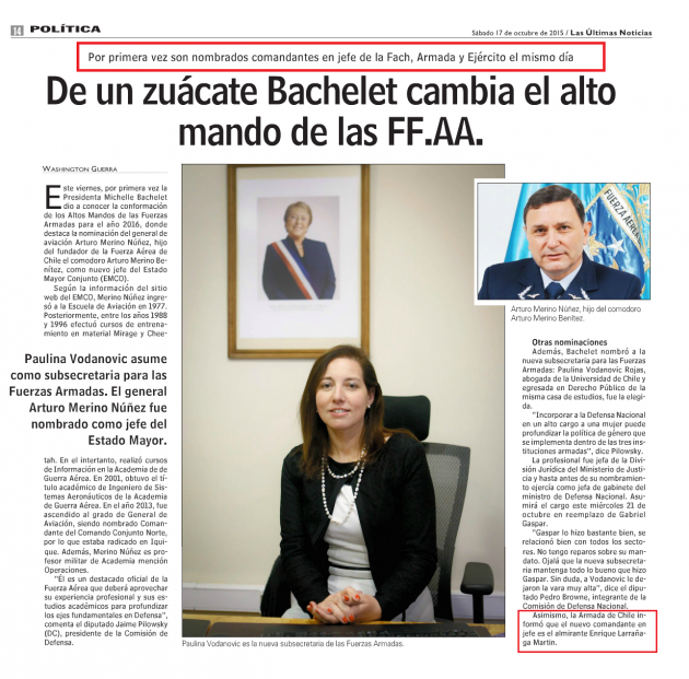 La crónica, en su extenso texto habla del cambio de jefe Estado Mayor Conjunto “destaca la nominación del general de aviación Arturo Merino Núñez, hijo del fundador de la Fuerza Aérea de Chile el comodoro Arturo Merino Benitez, como nuevo jefe del EMCO”, pero nada menciona sobre los supuestos cambios de comandantes en jefe del Ejército y Armada.