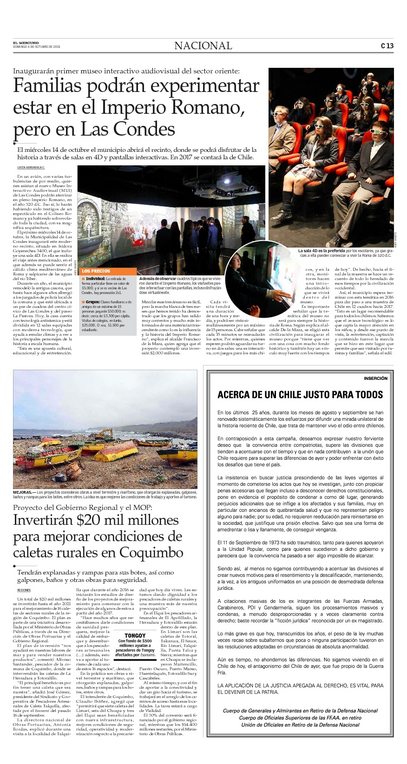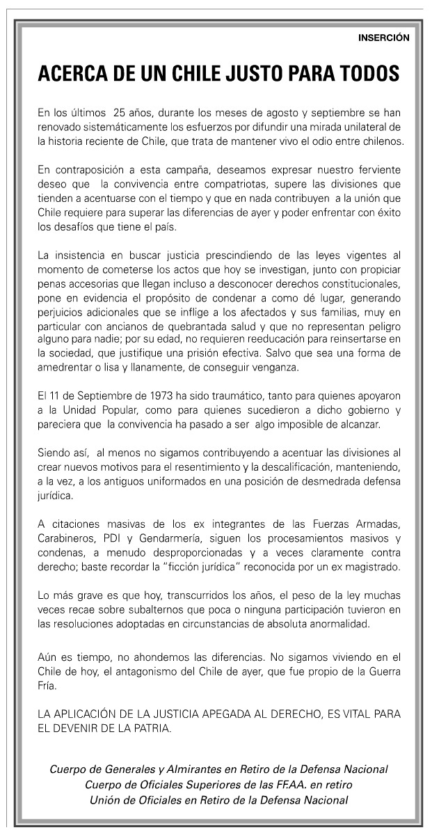 Ayer domingo, en la página C13 el Cuerpo de Generales y Almirantes en Retiro de la Defensa Nacional, el Cuerpo de Oficiales Superiores de las FF.AA. en retiro y la Unión de Oficiales en Retiro de la Defensa Nacional, publicaron y firmaron un documento titulado “Acerca de un Chile justo para todos”, en el que denuncian una campaña político-comunicacional en su contra.