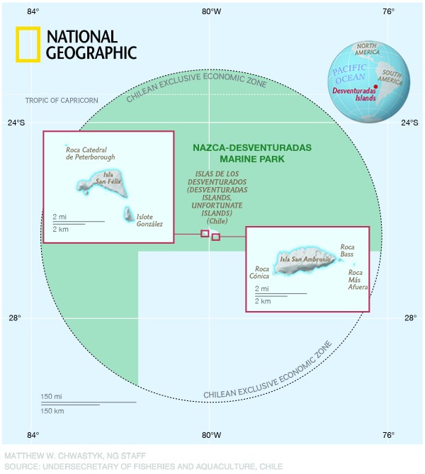 “Con estas declaratorias Chile incrementa sustantivamente la protección oficial de su territorio marítimo en las islas oceánicas, el que ahora llega a los 460 mil kilómetros cuadrados, triplicando los 150 mil km2 que teníamos protegidos hasta ahora, principalmente con el parque Motu Motiro Hiva”. En conjunto con la ONG Chilena Oceana y NATIONAL GEOGRAPHIC , llegó a las Desventuradas el 2013 – (islas San Félix y San Ambrosio), emplazadas a alrededor de 900 kilómetros del puerto de Chañaral. Al finalizarla se elaboró un informe sobre su vida marina y el hábitat, el cual incluyó una propuesta de creación de un gran parque marino que las circundara, más allá de la zona de donde los pescadores artesanales de Juan Fernández capturan las langostas (la mitad del año la capturan en estas islas).