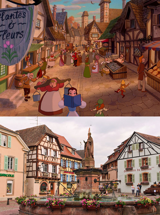 La Bella y la Bestia: en el pueblo de Alsacia, una pintoresca región al noroeste de Francia, que a través de la mayor parte de la historia de Europa, ha sido políticamente alemana. De ahí la mezcla de ambas culturas, que se encuentra en los nombres de los sitios y su bonita arquitectura pastoral.