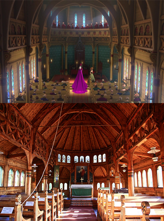 Frozen: También conocida como la iglesia inglesa, ya que comenzó su construcción una mujer inglesa, Margaret Green, que vivía allí cerca con su amor Knut Kvikne. La iglesia fue construida para que pudiera practicar su fe anglicana, pero murió antes de estar acabada.