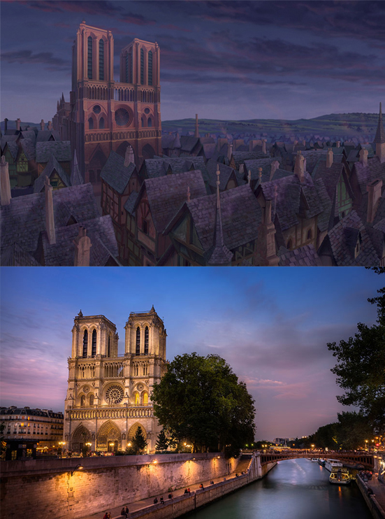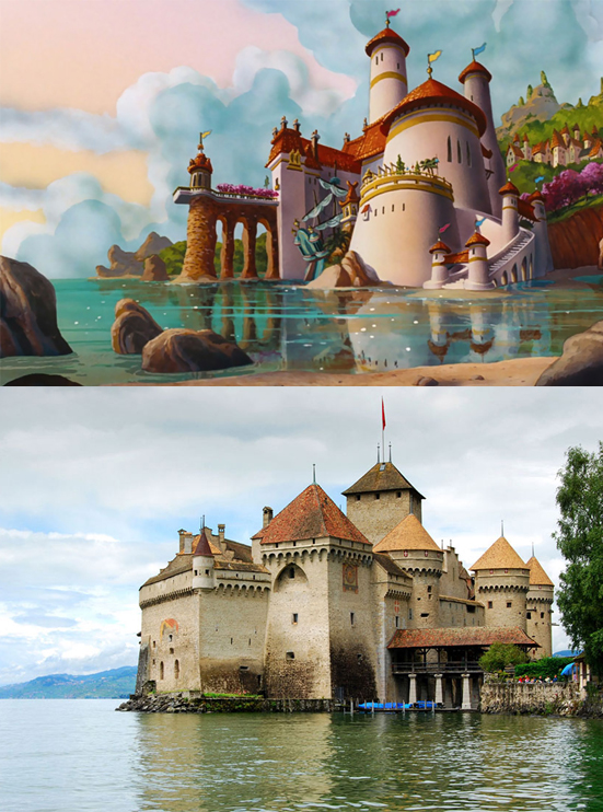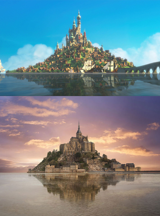 Enredados: El reino de Corona de Enredados está inspirado en el monte Saint-Michel en Normandía, Francia. La comuna de esta isla queda periódicamente aislada de tierra por la marea, haciéndola una posición fácilmente defendible. Hoy en día es una atracción popular para turistas.