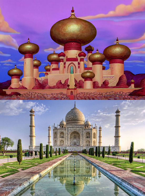 Aladdin: Aunque muchos piensan que es un palacio, es en realidad una magnífica tumba hecha con mármol blanco y rodeada de jardines que el Emperador Shah Jahan comenzó a construir en 1632 para su esposa favorita, Mumtaz Mahal.