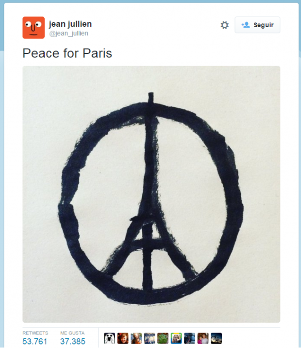 A las pocas horas de ocurrido los ataques en París, surgió un dibujo con el ícono de París, la Torre Eiffel que orlada en un círculo recuerda el símbolo universal de la Paz. Rápidamente se tomó las redes sociales.