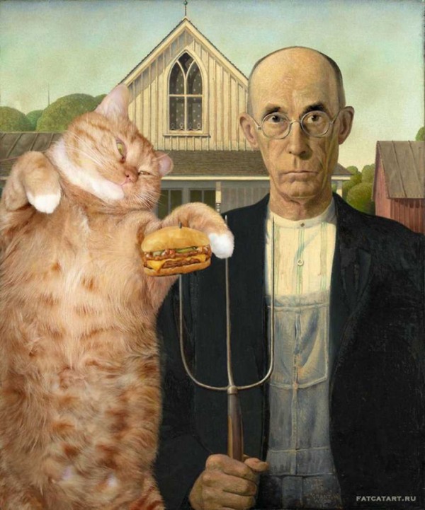 Mi profesión es artista y Zarathustra eligió la persona correcta para ser su esclavo humano. Hoy tengo más de 7000 fotos de Zarathustra en mi computador. Pongo el gato dentro de imágenes digitales de pinturas famosas y las retoco con mucho cuidado con Photoshop. Es un reto, él tiene que integrarse impecablemente en la obra maestra, su posición y su expresión tienen que ser perfectos, y a veces puedo tardar meses en encontrar la foto ideal. Imprimo mi trabajo y entonces pinto encima, imitando el estilo de los maestros para que la imagen del gato parezca completamente natural en las obras más conocidas.
