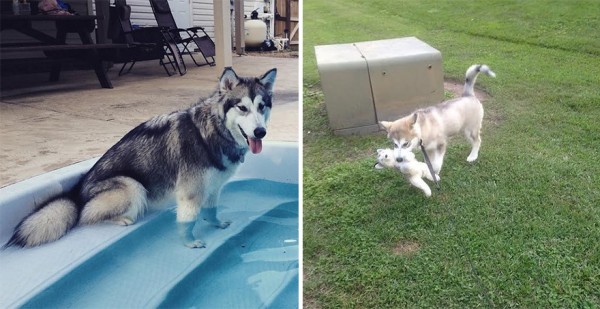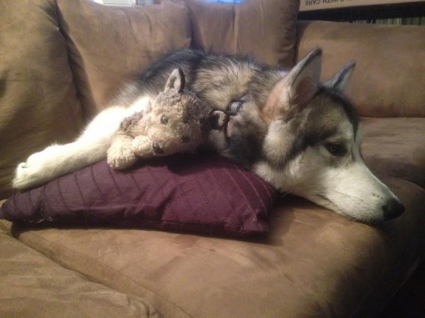 Este es Luca, un perro de raza siberiano al que le encanta destruir sus juguetes. Karissa Lerch, de Carolina del Norte, siempre quiso un perro, pero como no tenia dinero mientras estaba estudiando en la universidad. Se compró un perro de peluche en la tienda «Toys-R-Us». Años después, por fin tuvo un perro de verdad y le regaló su querido peluche. Y Luca y el peluche se han volvieron inseparables.