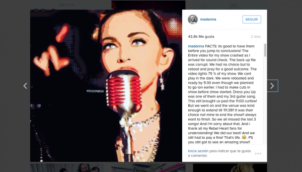 A través de su Instagram aclaró el incidente: “Hechos: Es bueno saberlos antes de sacar conclusiones. El video de mi show se estropeó cuando llegué a la prueba de sonido. No tuvimos más remedio que reiniciar y orar para poder lograr tener un buen resultado. El 75% de la iluminación de mi show proviene del video. No podemos tocar en la oscuridad. Estábamos listos para empezar a las 9:30 aunque teníamos planeado empezar antes. Tuve que hacer cortes en el show antes de empezar. “Dress you up” era una de ellas y mi tercera canción de guitarra. Con esto incluso nos pasamos del tope de las 11:00. Pero seguimos y el local fue amable y nos dejó extenderlo hasta las 11:39. Fue su decisión y no la mía, terminar el show. Así que nos perdimos tres canciones y lo lamento mucho”, escribió Madonna.