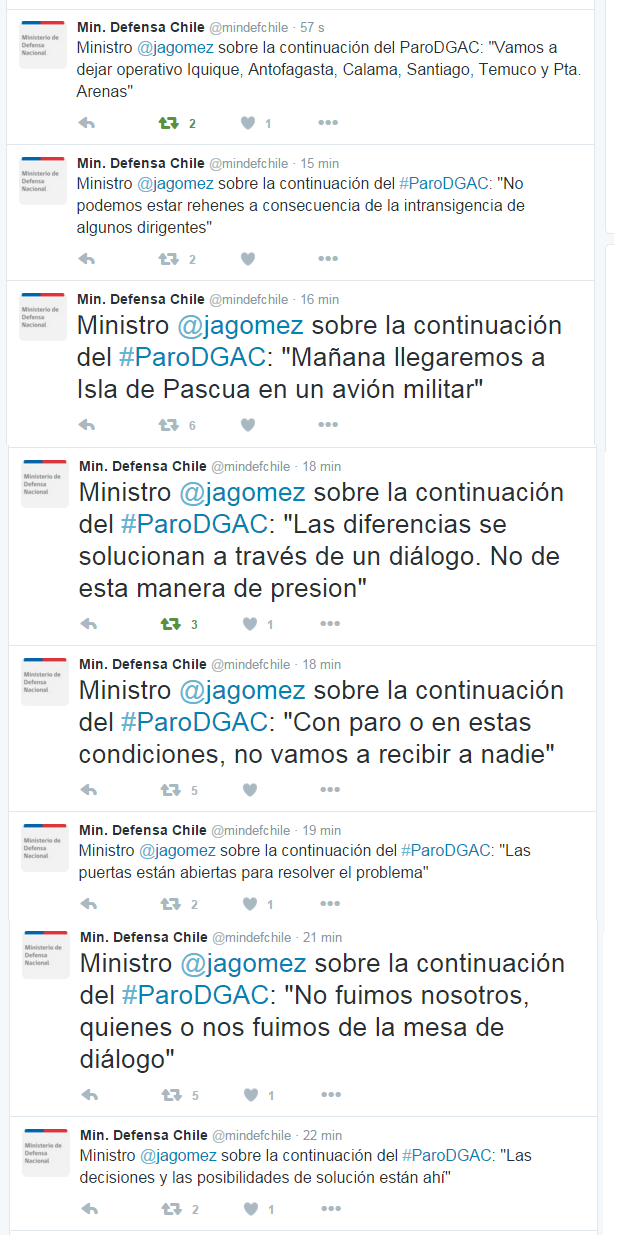 Una vez conocida la determinación de José Pérez, máximo dirigente de los funcionarios de la Dirección General de Aeronáutica Civil (DGAC), el Ministerio de Defensa, a través de su cuenta oficial en Twitter, lanzó una andanada de tuits en los que rechaza el anuncio de paro indefinido señalando que: «Es impropio, impresentable, que se asuste a la gente». «Nos parece inconcebible que tengan de rehenes a los chilenos»