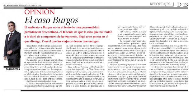 Este domingo, el primero del año 2016, el abogado-rector y columnista Carlos Peña, en su tradicional sermón dominical vuelve a carga no solo contra la Presidenta Bachelet, sino que con toda contra la izquierda usando como ejemplo lo que él llamó “El caso Burgos», ocurrido en la víspera del fin de año y que desató una “pataleta” democratacristiana. El Mercurio, aviva el motín DC publicando a página completa: “Ex ministros, subsecretarios y militantes históricos de la DC piden una profunda corrección al rumbo del Gobierno, a través de una carta dirigida a la colectividad”.
