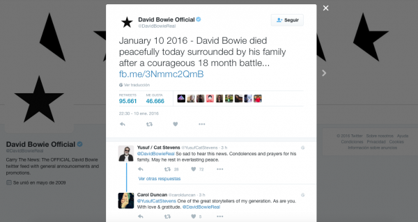 La noticia de la muerte del cantante David Bowie, una de las figuras más emblemáticas de la música rock ha remecido las redes sociales, el ‘hashtag’ #RIPBowie ya era trending topic en Twitter apenas media hora después del anuncio del fallecimiento.