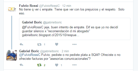 Su twitteo no tardó en tener respuesta ya que Rossi (@fulviorossic) inmediatamente le dijo a Boric «Deja de mentir Gabriel. No he entregado facturas falsas a nadie. Gana un espacio en la izquierda sin mentir!», y no lo dejó ahí, sino que continuó diciendo «Gabriel si es por hacerse cargo de infundidos y comentarios venenosos tendría que darle crédito a esto y no se lo doy». Rossi se refiere a la nota pararecida en www.elmuro.cl el 30 de octubre de 2015 que se titula: Gabriel Boric: Los oscuros «negociados» del diputado por Punta Arenas. Ahí se cuenta que los padres de Boric venderían millonarios terrenos al Fisco, también habla de una solicitud de devolución al Servel que sería irregular, y de la particiàción del diputado en una empresa que recibe fondos públicos, entre otras acusaciones.