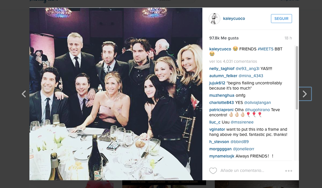 La encargada de compartir la foto fue Kaley Cuoco y lo hizo a través de su cuenta de Instagram, el elenco de Friends posó junto al elenco de la serie The Big Bang Theory.