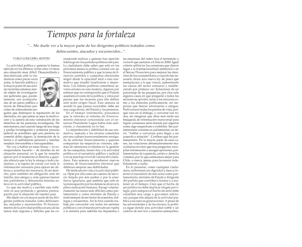 Titulada “tiempos para la fortaleza”, Longueria expone que: “La actividad política y quienes la hemos ejercido en los último 20 años vivimos una situación muy difícil. Desacreditada y desvalorizada ante la ciudadanía como pocas veces antes, la función pública y la mayor parte de sus actores recientes estamos siendo objeto de investigaciones judiciales que, paralelamente, son acompañadas de un juicio público a través de filtraciones parciales de antecedentes sesgados que destruyen la reputación de los afectados, sin que jamás se sepa la motivación y la autoría de esta vulneración de los derechos de las personas investigadas. De esta manera, aun cuando luego de una larga y prolija investigación y posterior proceso judicial se acreditara que una persona no cometió delito alguno, la destrucción de la honra y el sufrimiento personal y familiar resultan irreversibles e irrecuperables”.