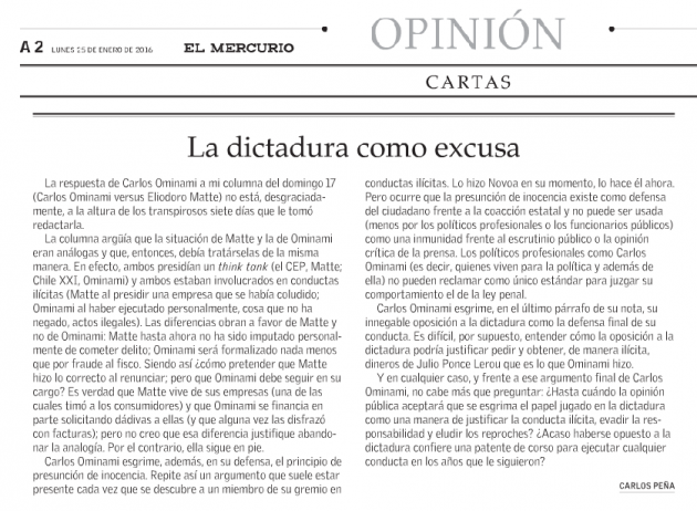 La columna que desató la rabia del ex senador dice: “Carlos Ominami preside Chile XXI y será formalizado por un grave delito tributario: se habría concertado para defraudar al fisco. Luego, si la renuncia de Matte fue correcta -si Eliodoro Matte hizo lo que cualquiera en su situación debía hacer-, entonces, Carlos Ominami debe también renunciar a la presidencia de Chile XXI. Después de todo, su caso es más grave que el de Eliodoro Matte. Matte no ha sido imputado de delito alguno; Ominami, sí. En consecuencia, si el directorio de Chile XXI piensa que Matte hizo bien renunciando, pero cree que Ominami no debe hacerlo, o no le pide la renuncia, está faltando a la imparcialidad”, escribió Peña. Carlos Ominami versus Eliodoro Matte