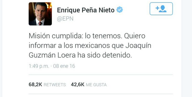 Ante de oficializar la información de la recaptura de “El Chapo” Guzmán, la noticia la adelantó en Twitter el Presidente, Enrique Peña Nieto. «Misión cumplida: lo tenemos. Quiero informar a los mexicanos que Joaquín Guzmán Loera ha sido detenido», escribió @EPN.