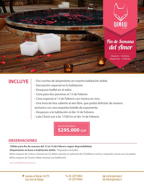 El Hotel QAMAQI cuenta con 2 suites con camas king size especialmente hechas por artesanos de la zona y 16 habitaciones dobles, todas equipadas con jacuzzi, servicios de internet y televisión satelital. Cuenta además con piscina temperada, servicios de masajes ( chocolaterapia) y un exquisito restaurant con una carta internacional de la mano de dos reconocidos chef , todo esto acompañado del ambiente espectacular que ofrece el Cajón del Maipo.