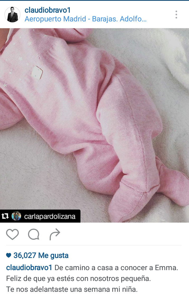 A través de las redes sociales, Claudio Bravo anunció el nacimiento de su hija. «De camino a casa a conocer a Emma. Feliz de que ya estés con nosotros pequeña. Te nos adelantaste una semana mi niña», escribió el arquero en su cuenta de Instagram