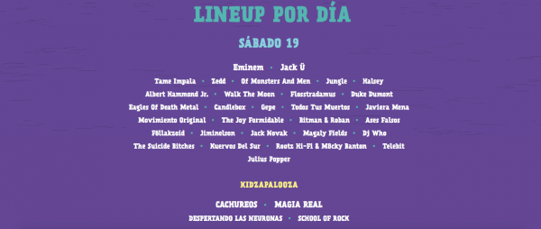 El día sábado 19, el festival será encabezado por el debut del rapero Eminem y el proyecto electrónico de los productores Diplo y Skrillex, bajo el nombre de Jack Ü. Además, los australianos Tame Impala, una de las bandas más aplaudidas por la crítica especializada; los islandeses Of Monsters And Men; y la próxima ídola del pop estadounidense con solo 21 años, Halsey, serán los platos fuertes del evento en su primera jornada.