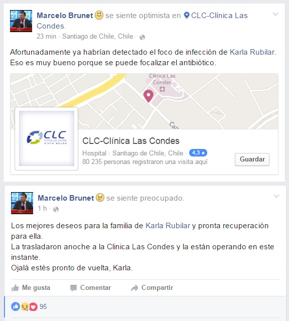 Este sábado, el abogado Marcelo Brunet publica en su cuenta de Facebook que «Los mejores deseos para la familia de Karla Rubilar y pronta recuperación para ella. La trasladaron anoche a la Clinica Las Condes y la están operando en este instante», también cuenta que «Afortunadamente ya habrían detectado el foco de infección de Karla Rubilar. Eso es muy bueno porque se puede focalizar el antibiótico».