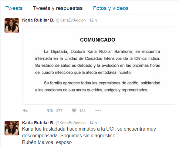 Ayer Infogate informó del grave estado de salud de la parlamentaria independiente que se encontraba internada en un centro asistencial capitalino. De hecho su esposo publicó un comunicado en la cuenta de twitter de la paralamentara, el delicado estado de salud de ella.