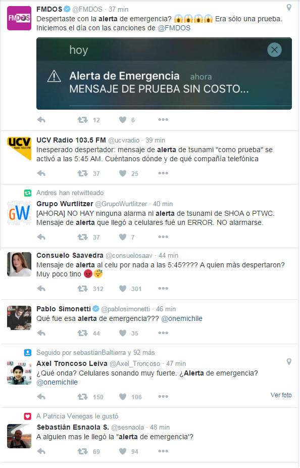 recordemos que a las 05:40 horas de este lunes miles de celulares de diversas compañías recibieron un ruidoso mensaje de «alerta». Este habría sido emitido por un error de la empresa de telefonía celular Movistar. «No fue una alerta emitida por la Onemi ni una acción coordinada por la Subtel (Subsecretaría de Telecomunicaciones), por lo que estamos exigiéndole a la empresa que aclaré qué fue lo pasó» señaló el ministro Gómez-Lobo.