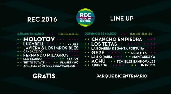Este 12 y 13 de marzo Concepción se llena de música en vivo gracias a REC: Rock en Conce, la segunda versión del festival de música gratuita y al aire libre más grande del sur de Chile. Dos jornadas de música con lo mejor de los sonidos penquista y nacional en el Parque Bicentenario en Concepción, que congrega a las mejores bandas locales, invitados nacionales y, por esta vez, a la banda mexica Molotov absolutamente gratis.