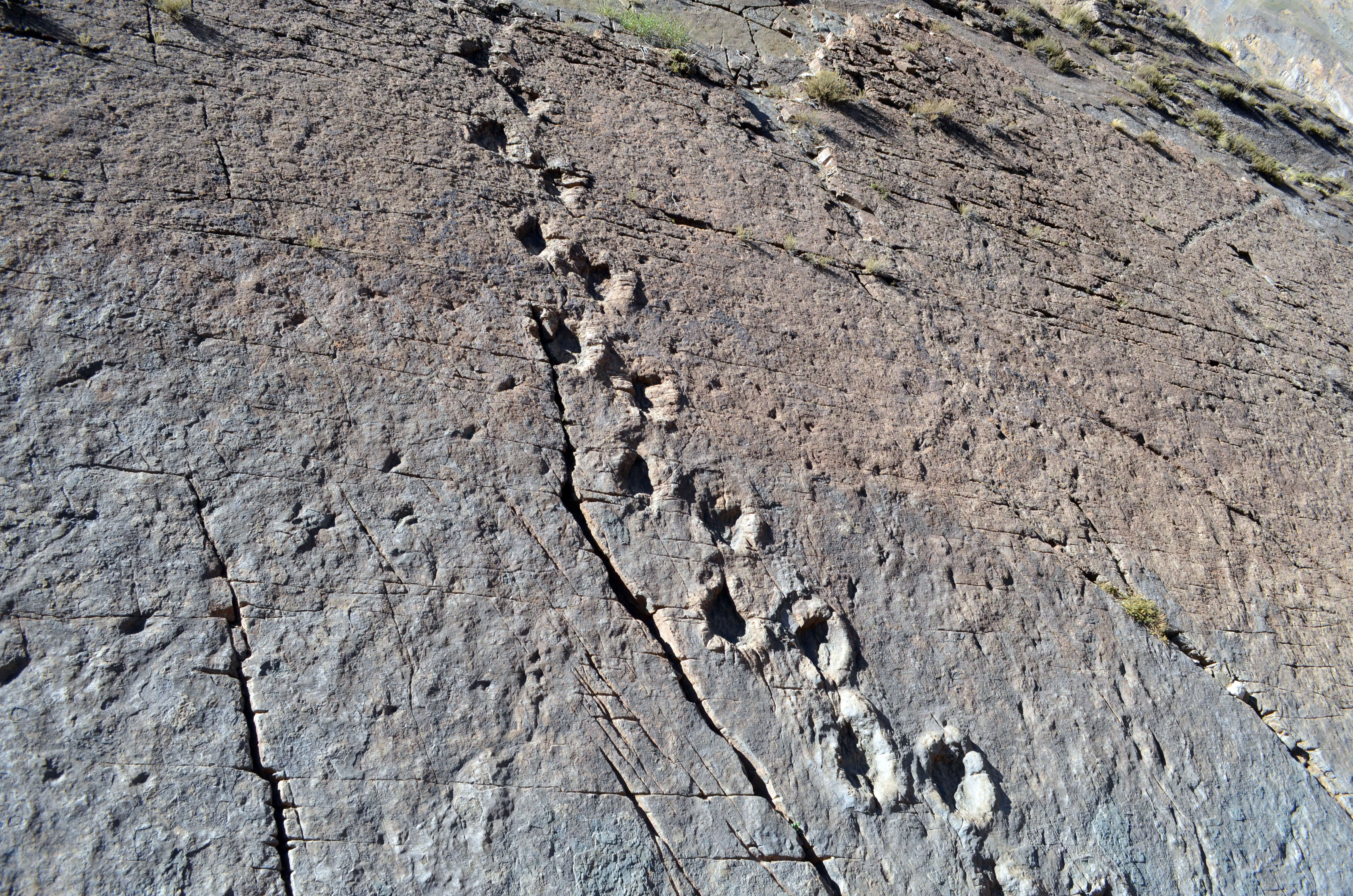 Las huellas pertenecen a la Jurásica y fueron dejadas en el barro por un Terópodo (1), un Ornitólogo (4) y un Saurópodo (3) y se solidificaron gracias a un suceso climático-volcánico, las que posteriormente afloraron con el paso del tiempo, quedando petrificadas con las huellas impresas de estas especies, cuando se formó la Cordillera de los Andes.