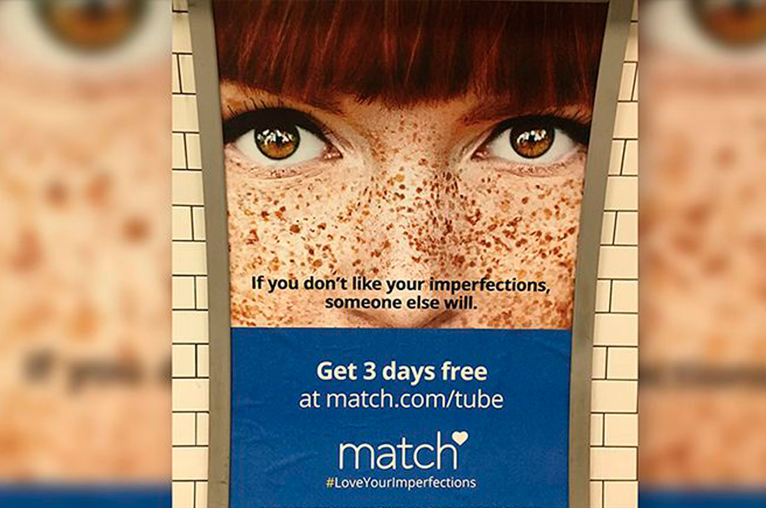 ¿Las pecas son «imperfecciones»? Eso es lo que da a entender la nueva campaña de publicidad de la web de citas Match.com. En el metro de Londres, la empresa ha puesto carteles que no han dejado indiferente a nadie. En ellos, se ve la foto de una mujer pelirroja y con pecas junto con el slogan: «Si a ti no te gustan tus imperfecciones, a alguien más le gustarán».