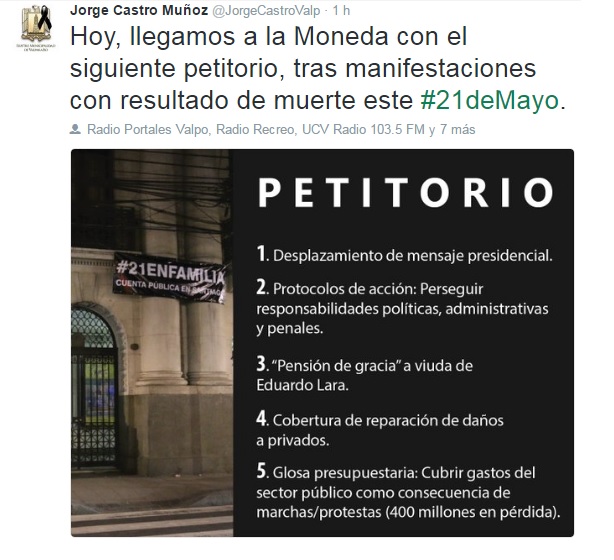 A poco más de 24 horas de los gravísimos incidentes ocurridos en el centro de Valparaíso que culminaron con el incendio de un edifico histórico y la muerte de un anciano funcionario municipal, llegó este lunes al Palacio de La Moneda el alcalde de Valparaíso, el UDI Jorge Castro, acompañado del Concejo Municipal y de parlamentarios de la región para pedirle –casi suplicarle- al Gobierno que cambie la fecha de la Cuenta Presidencial ante el Congreso Pleno y ante la Nación para –entre otroas cosas “recuperar una fecha emblamática”.