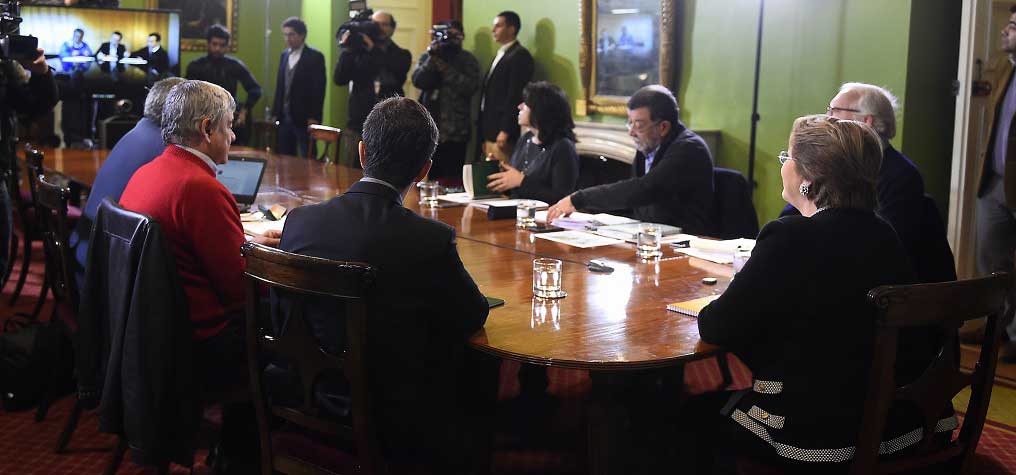 La presidenta Michelle Bachelet, llegó de Inglaterra en la mañana y se trasladó a La Moneda donde encabezó una reunión con varios de sus ministros para abordar la crisis en Chiloé, producida -entre otros factores- por una inusual y agresiva Marea Roja.
