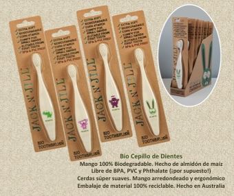 También está el primer cepillo de dientes para niños diseñado y fabricado con mango biodegradable y reciclable, hecho de almidón de maíz. Posee cerdas suaves y un mango ergonómico. Es l00 % biodegradable, libre de BPA, PVC y Phthalatos, creados con bellos diseños de dinosaurio, hipopótamo y koala. Y, desde los tres años en adelante existe, Buzzy Brush un cepillo eléctrico musical, que incluso es utilizado por adultos. Incluye 6 adorables stickers por lo que uno puede personalizar su cepillo.
