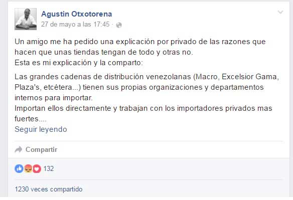 “Esta es mi explicación y la comparto: Las grandes cadenas de distribución venezolanas (Macro, Excelsior Gama, Plaza’s, etcétera…) tienen sus propias organizaciones y departamentos internos para importar. Importan ellos directamente y trabajan con los importadores privados más fuertes.