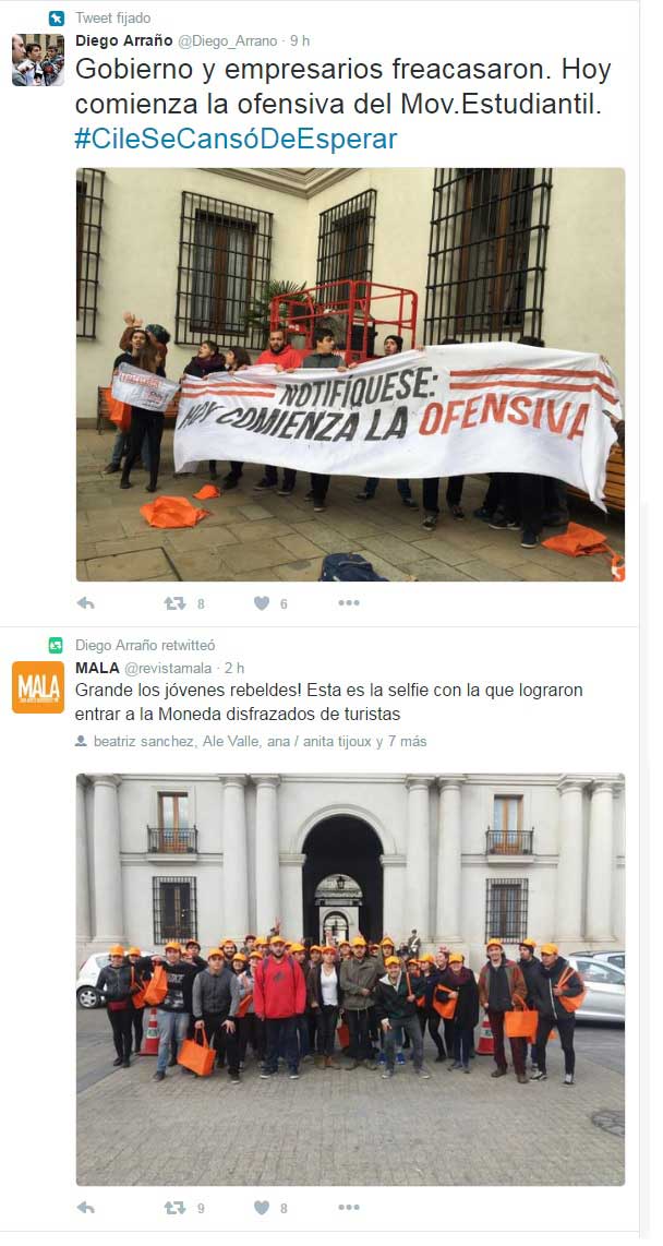 Nuevo dolor de cabeza para Carabineros y para el ministro del Interior, el jefe de las policías, ya que este martes decenas de estudiantes lograron vulnerar todas las medidas de seguridad del mismísimo Palacio Presidencial e ingresaron -como un tropel- al Patio de Los Cañones, donde desplegaron un lienzo con la frase: «Notifíquese: hoy comienza la ofensiva», siendo finalmente reducidos por la policía y transformándose en la primera protesta dentro de la casa de Gobierno.