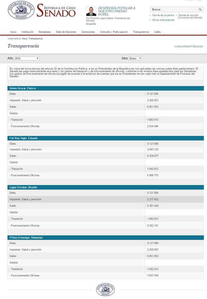 Sólo para considerar en los Estados Unidos los ex jefes de Estado reciben una pensión de 200.000 mil dólares cerca de 11 millones de pesos mensuales. En Chile están bastante cerca porque la dieta es de $9.121.806 actualizada a enero de este a{os. Según informa el Senado de la República.