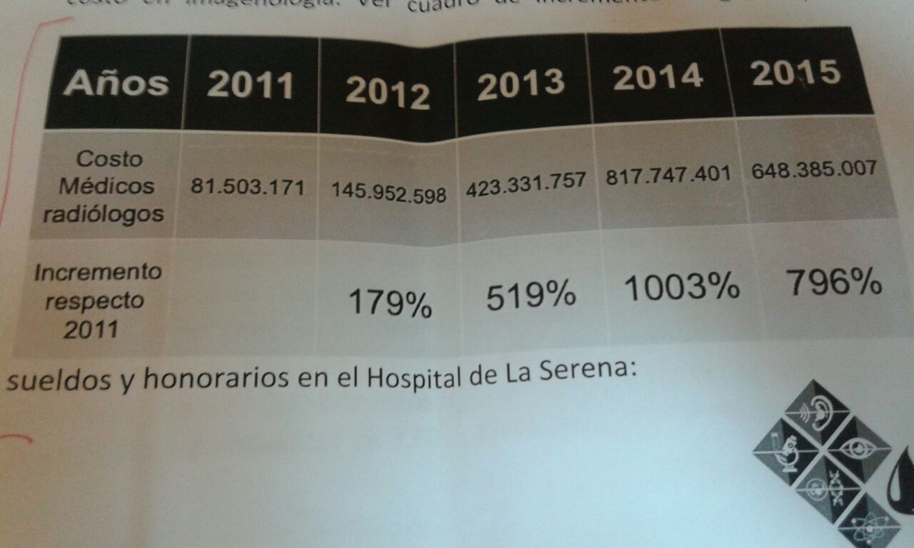 Como ejemplo, el dirigente citó el caso del Hospital de La Serena donde los sueldos de los médicos radiólogos se han incrementado en un 796 % en los últimos cinco años. Esto, pese a que casi la mitad de dichos exámenes (465) no han sido informados a los pacientes.