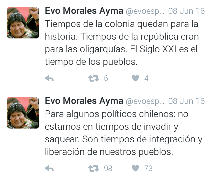 Morales indicó en twitter «Para algunos políticos chilenos: no estamos en tiempos de invadir y saquear. Son tiempos de integración y liberación de nuestros pueblos».