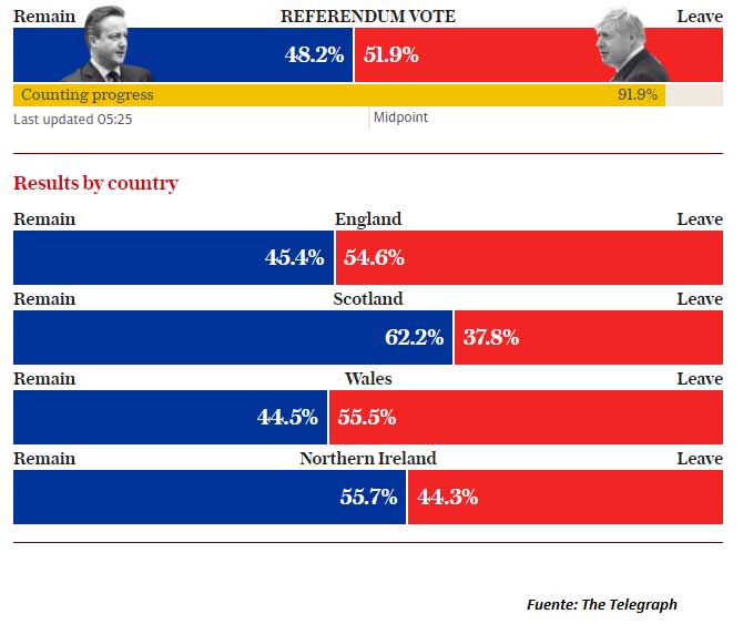 En el reporte de las 06:12, Europa Press informa que: “El Reino Unido avanza con paso firme a la puerta de salida de la UE El referéndum sobre la permanencia de Reino Unido en la Unión Europea confirma la tendencia hacia la salida de la segunda economía del continente, ya que superado el ecuador del escrutinio, el Brexit lidera cómodamente los resultados, una evolución que se ha dejado notar ya en los mercados de divisas, donde la libra ha experimentado una abrupta depreciación, con niveles inéditos desde 1985, lo que sugiere la posibilidad de medidas de contingencia por parte del Banco de Inglaterra”.