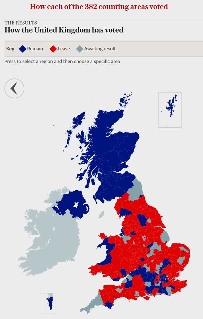 El mapa del Reino Unido según la votación: En azul los que votaron a favor de quedar en la UE y en rojo los que no.