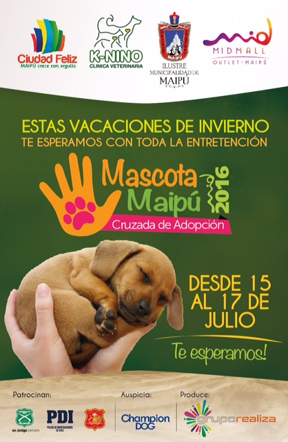 La Ilustre Municipalidad de Maipú junto a Midmall Outlet Maipú y el médico veterinario Eduardo Montoya de la Clínica K-Nino invitan a la primera versión de la CRUZADA DE ADOPCIÓN DE MASCOTAS 2016 que se desarrollará la próxima semana, los días viernes 15, sábado 16 y domingo 17 de julio, para motivar la educación sobre tenencia responsable de animales y contribuir a que numerosos perritos y gatitos rehabilitados encuentren un hogar. A través de esta iniciativa se busca promover la adopción animal bajo el concepto de tenencia responsable.