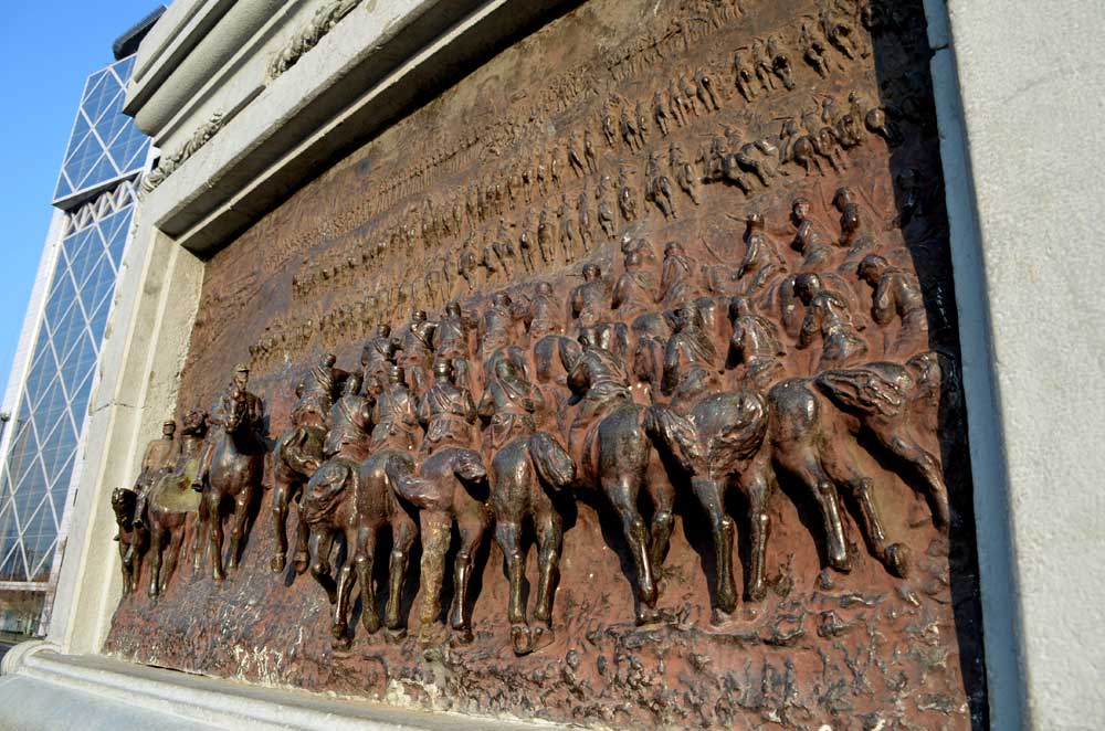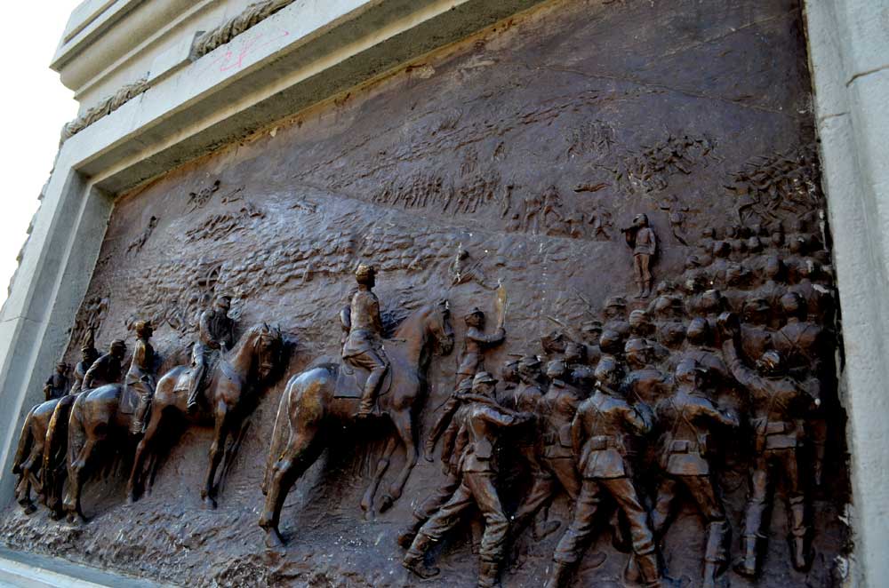 En los costados de la base del monumento sobresales dos relieves que recrean las batallas de Chorrillos y Miraflores y que sellaron la victoria militar chilena sobre Perú.