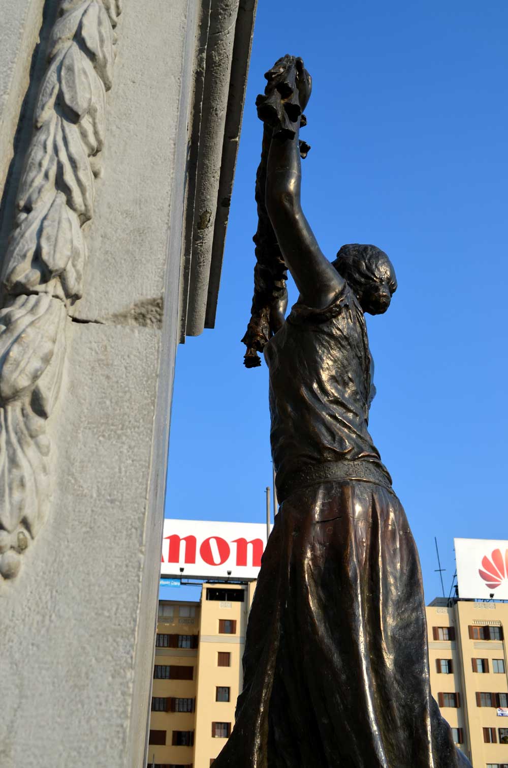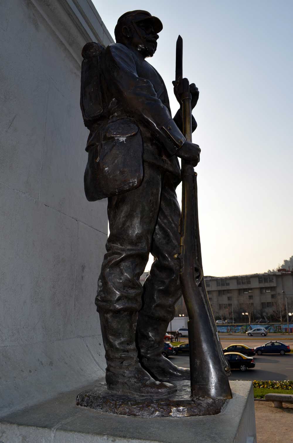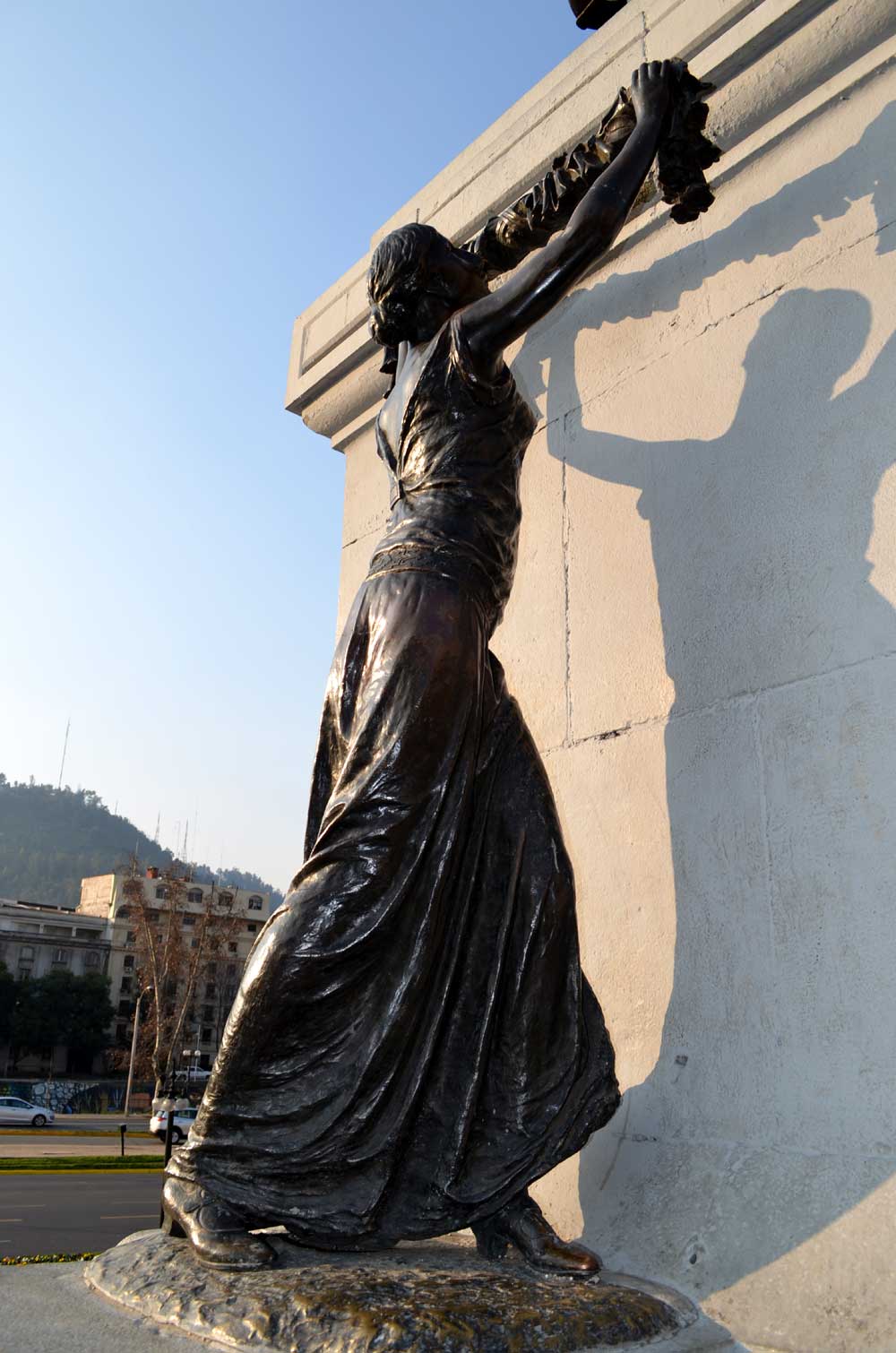 Sobre la base del monumento y frente a Baquedano, una estatua de tamaño natural eleva sus brazos con una guirnarlda de copihues y laureles.