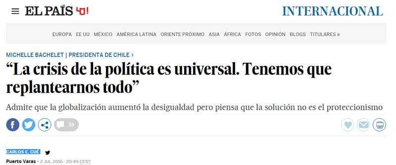 La entrevista realizada por el periodista Carlos E. Cué, y que publica este sábado, en su introducción agrega “Rodeada de países con gobiernos cada vez más liberales –Argentina, Perú, Brasil, Paraguay y con Evo Morales en Bolivia en horas bajas– resiste con su socialdemocracia moderada que apuesta por el libre comercio, aunque también atraviesa dificultades en las encuestas como casi todos los presidentes de la región. Bachelet es la anfitriona de la Cumbre de la Alianza del Pacífico (México, Colombia, Perú, Chile y 49 países observadores) en Puerto Varas que ratifica ese giro político con la llegada de Mauricio Macri -Argentina quiere entrar en la Alianza y hacerla converger con Mercosur- a un acuerdo que era anatema para la izquierda bolivariana. Bachelet defiende el libre comercio pero también reivindica las políticas de izquierda para compensar los costes de la globalización y evitar que la gente se vaya hacia fenómenos como el Brexit o Donald Trump”.