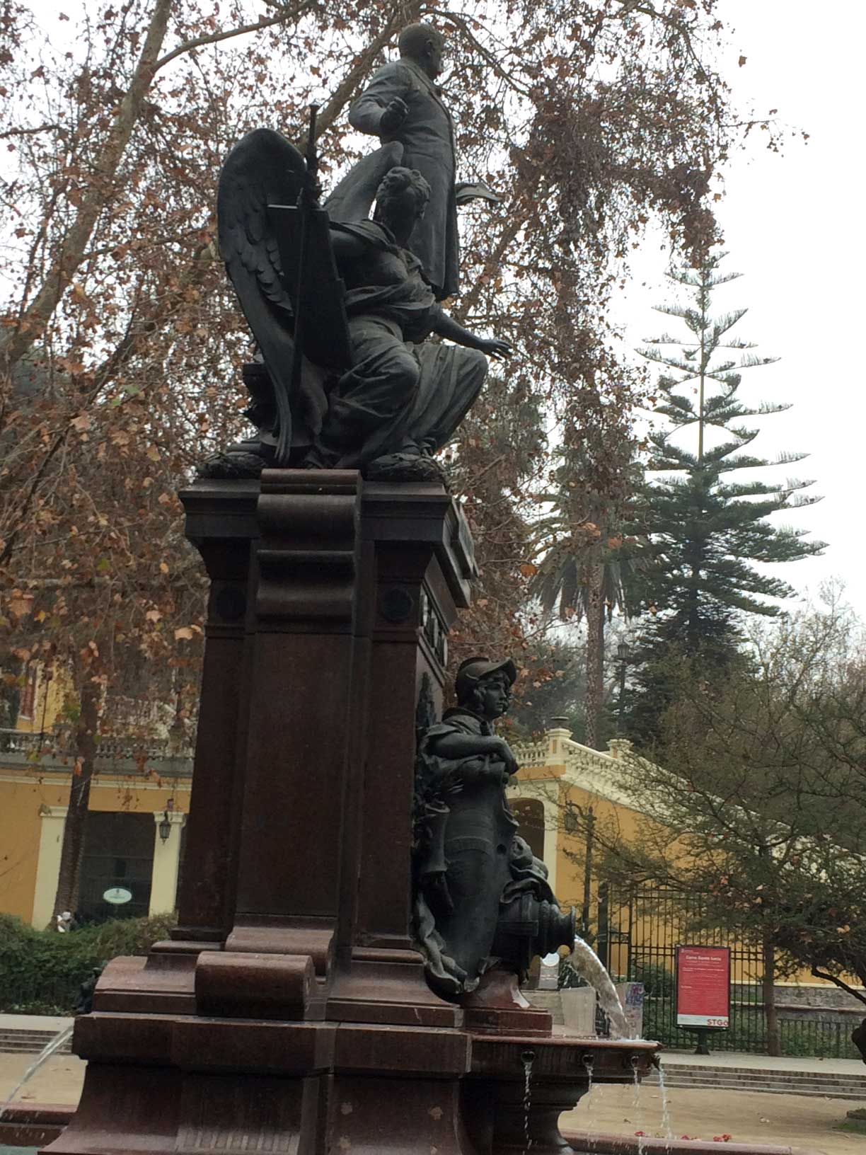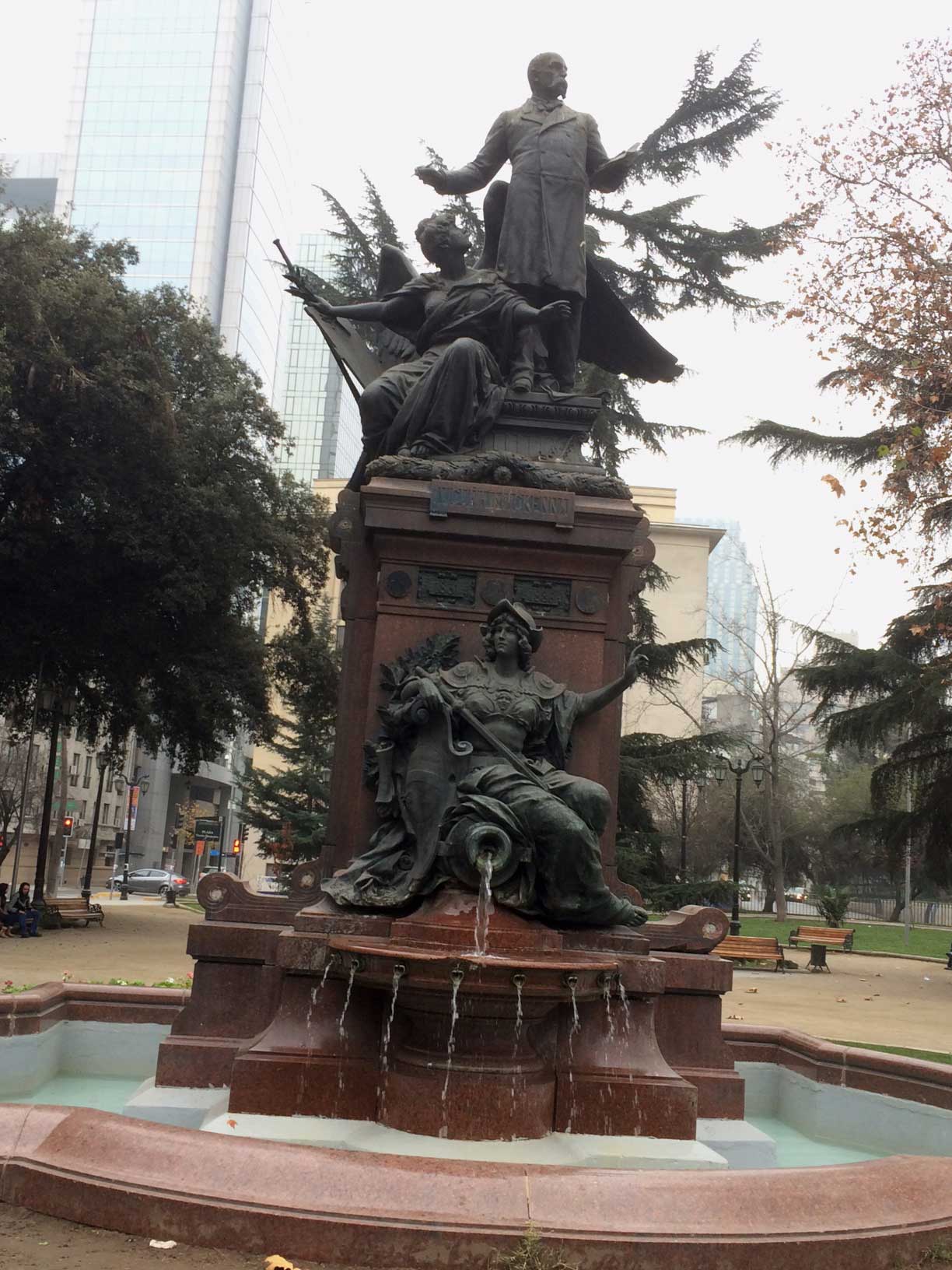 Entre los pocos monumentos con fuente de agua, destaca el de Benjamín Vicuña Mackenna, al costado del cerro Santa Lucía, un bello monumentos clásico del siglo XIX que lamentablemente tiene signos del vandalismo de los “roba monumentos”, le faltan coronaciones y ornamentos que realzaban el conjunto.