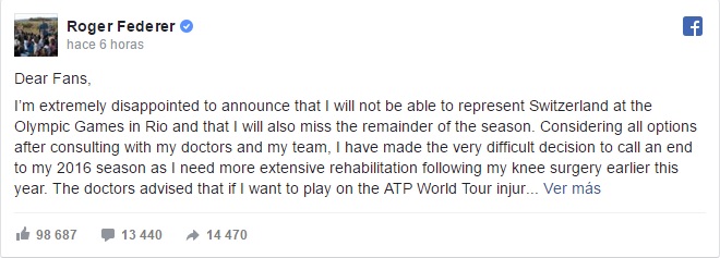 “Considerando todas las opciones después de consultar a mis médicos y a mi equipo he tomado la difícil decisión de poner fin a mi temporada. Necesito más tiempo de rehabilitación después de mi operación en la rodilla”, fue el mensaje del actual tres del mundo en el ranking ATP en la cuenta social creada por Mark Zuckerberg. Con esto, el medallista de Plata en singles en Londres 2012 no competirá en los Juegos Olímpicos de Río 2016 y se restará de la participación de los torneos en lo que queda de este año.