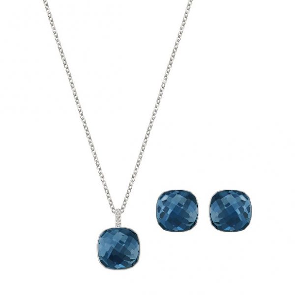 Este conjunto incluye un collar de 38 cm de largo y un par de aros ($99.900), conjunto que se convierte en una excelente opción para todas aquellas que buscan elegancia en su día a día. Ambos cuentan con cristales transparentes en brillantes tonos azules y con un baño de rodio.